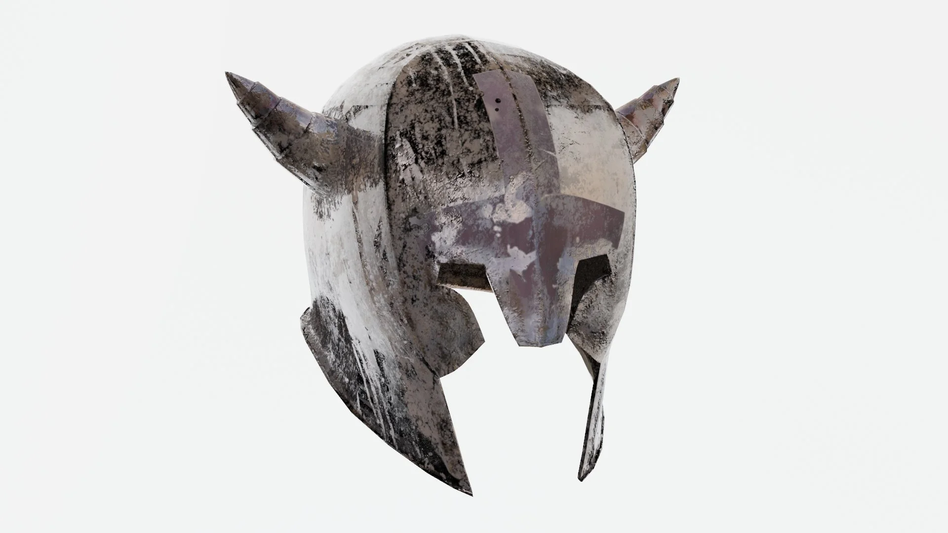 A metal helmet designed to look extremely worn from the environment, due to being left behind after the owner’s own demise.